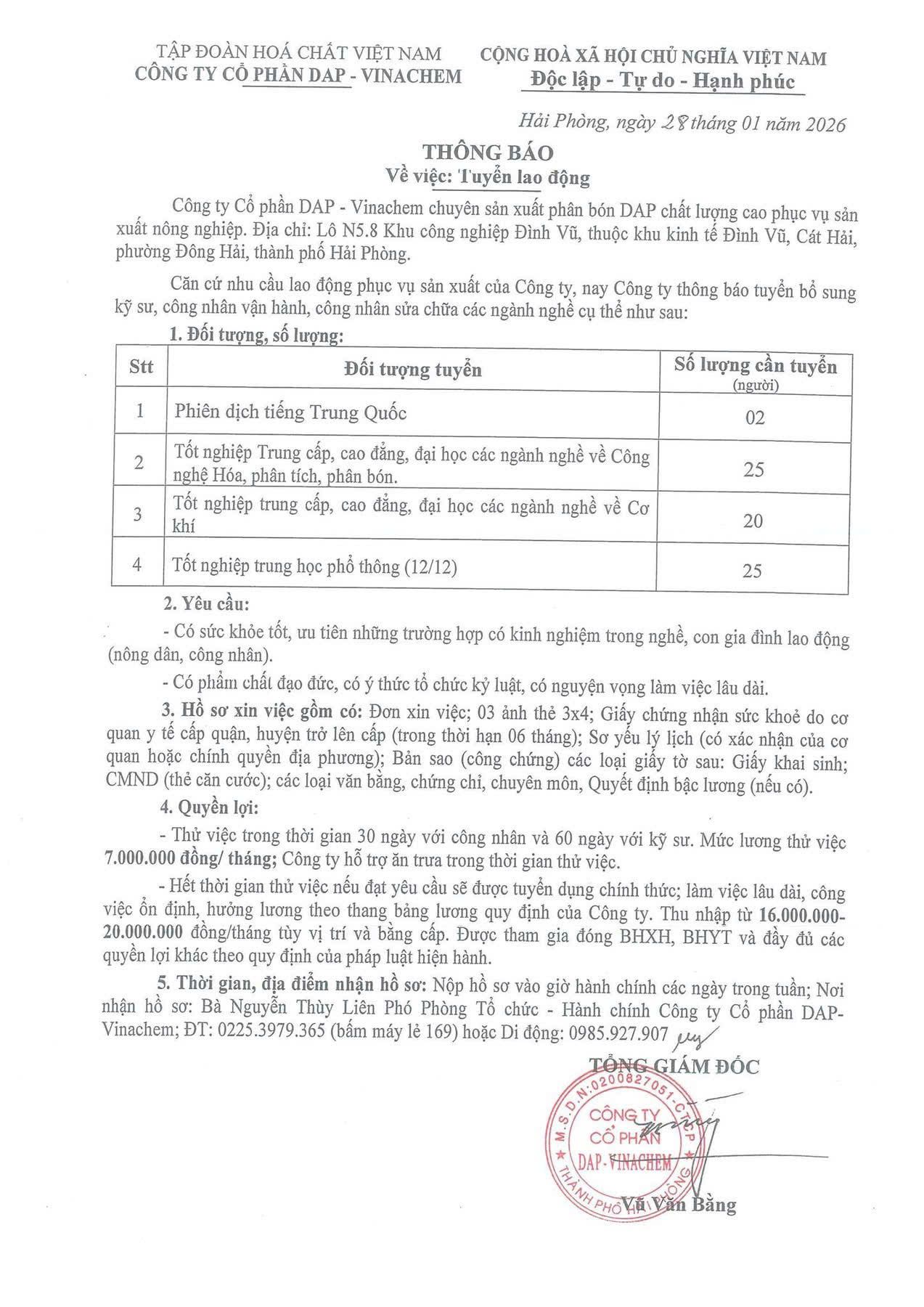 Công ty Cổ phần DAP - VINACHEM tuyển dụng lao động phiên dịch tiếng Trung Quốc